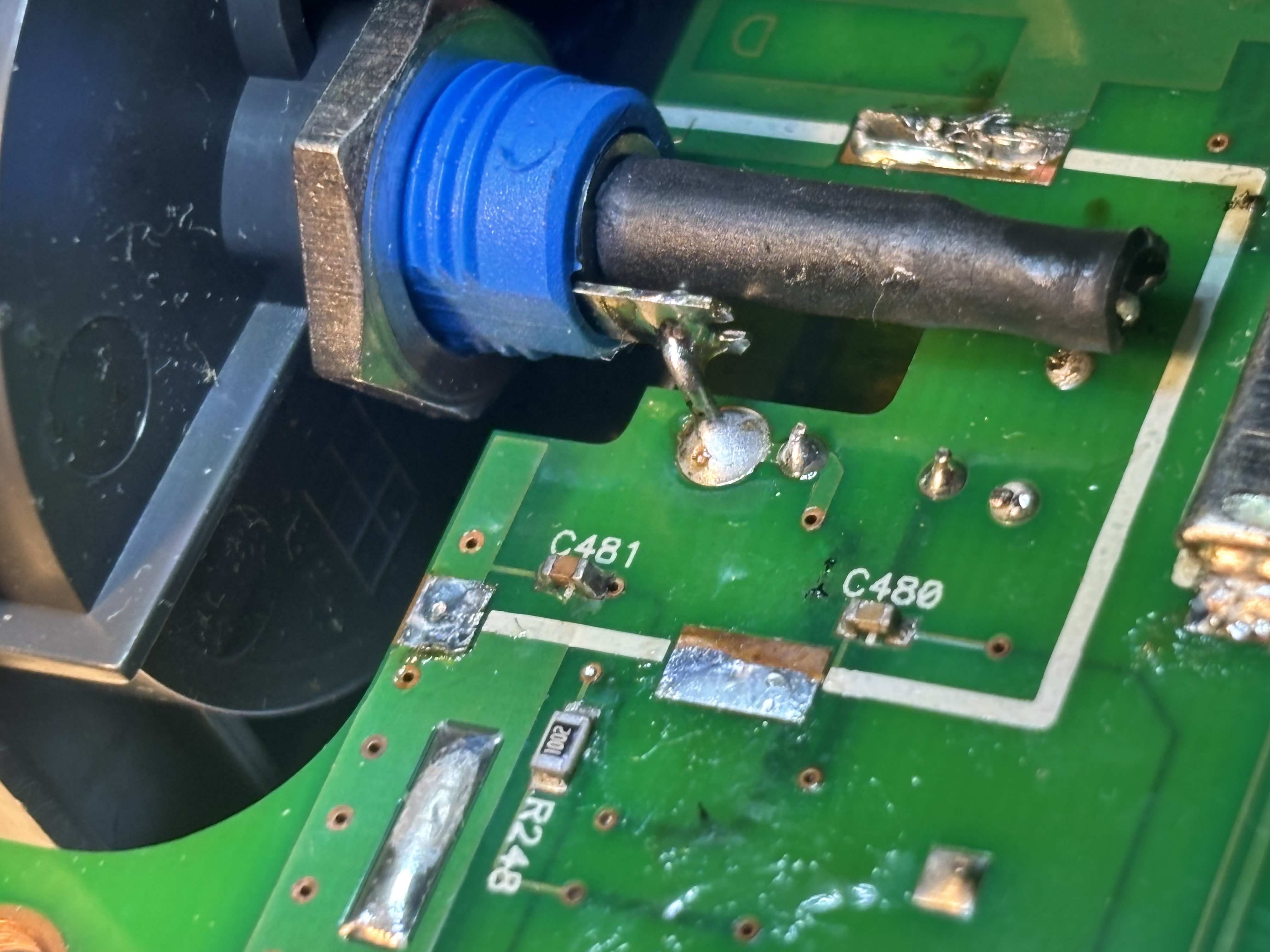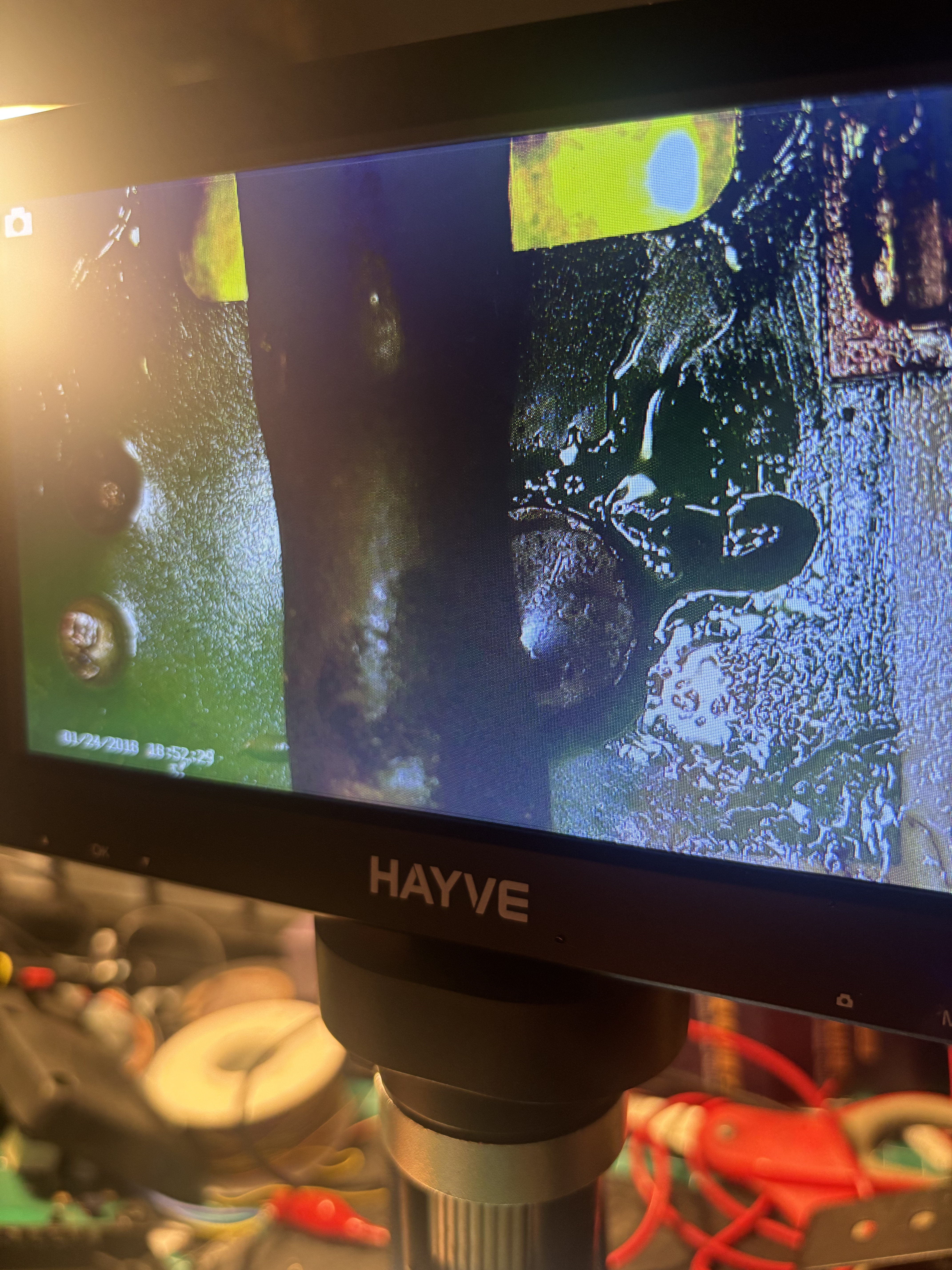 Inspection under a microscope revealed visible cracks on the joints for both channels. With my suspicions verified, I decided to desolder all the joints on the BNC, clean everything, and apply fresh solder. A reflow might have sufficed but I wanted to evaluate the condition of the pads before I reassembled as well.